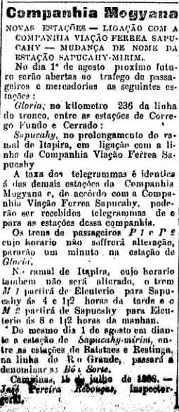 AO LADO: Finalmente anunciada a inauguração da estação de Sapucaí em 1 de agosto - no mesmo dia, abrir-se-á Gloria na linha-tronco e renomeia-se a estação de Sapucaí-Mirim, na linha do Rio Grande, para Boa Sorte (O Estado de S. Paulo, 18/7/1898). |
