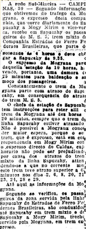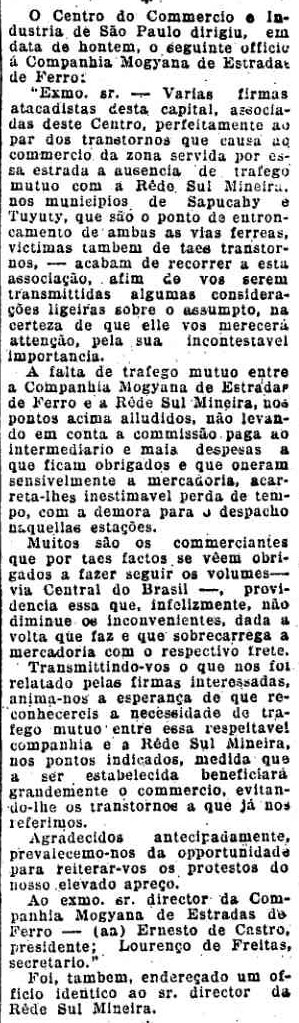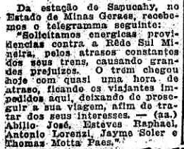 O tráfego mútuo entre as estações da Mogiana e da Rede Sul Mineira não funcionava nem na estação de Sapucaí, nem na de Jureia e quem perdia eram os usuários, que clamavam por uma solução (O Estado de