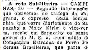 À ESQUERDA: A V. F. Sapucahy anuncia a construção da estação de encontro das linhas da CM e da VFS, Sapucahy, mas na reportagem saiu com o nome de Eleuterio (esta aberta anos antes) (O Estado de S. Paulo, 3/4/1898). |