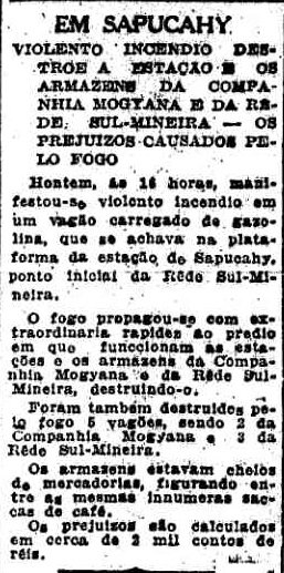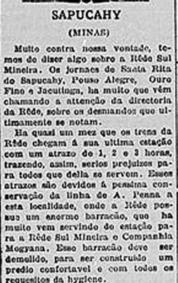 AO LADO: Queixas contra o mau estado da linha do ramal e também do "barracão" que serve como estação em Sapucaí. Menos de 2 meses depois, tudo pegaria fogo (ver logo abaixo) (Correio de S. Paulo, 26/1/1926). |