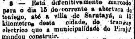 ACIMA: Abertura do tramway Piraju-Sarutaiá em 1915 (O Estado de S. Paulo, 11/8/1915).
