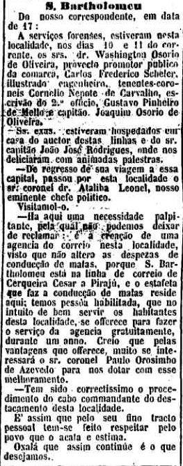AO LADO: A vida não era tão pacata assim em 1902 no bairro de São Bartolomeu. Havia reclamações sobre o correio também - CLIQUE SOBRE A FIGURA PARA LER TODO O ARTIGO (O Estado de S. Paulo, 20/4/1902). |