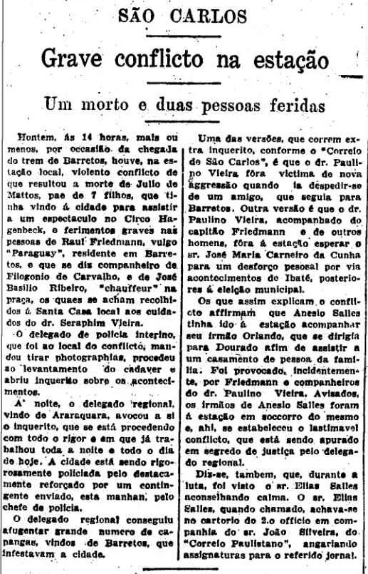 ACIMA: Conflito na estação de São Carlos em 1928 - CLIQUE SOBRE A MANCHETE PARA LER TODO O TEXTO (O Estado de S. Paulo, 19/11/1928).