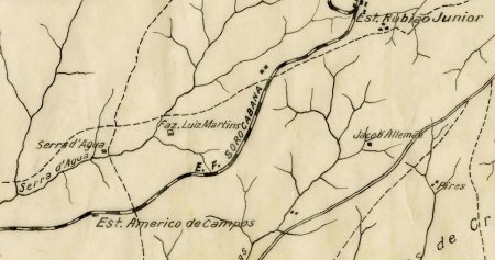 ACIMA: Mapa com a posição da estação de Serra Dagua (Ainda com o nome de Americo de Campos) em 1949. No mapa aparece também a estação de Rubião Junior (IHG, 1949).