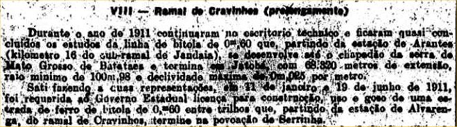 Serrana, em 1912. Também consta o prolongamento do ramal de