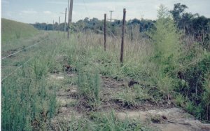 não se vê o rio por causa do mato alto, mas vê-se o aterro e a linha,