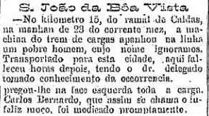 À ESQUERDA: Atropelamento na linha em São João da Boa Vista (O Estado de S. Paulo, 7/2/1900). |