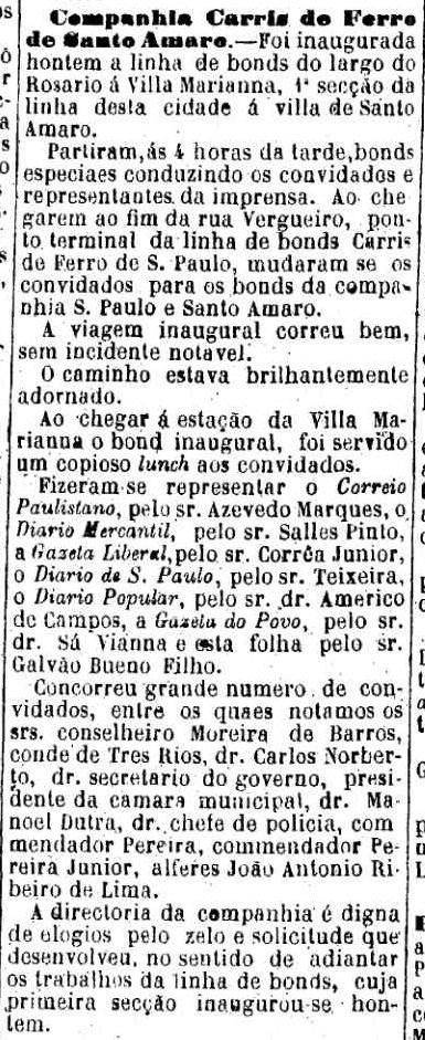 AO LADO: Quem precisava embarcar no trem a vapor para Santo Amaro e estações intermediárias dependia de um bonde a tração animal cuja linha terminava junto à estação de São Joaquim. Ele ia pela rua (hoje avenida) Liberdade e descia bem próximo a São Joaquim. Desta vez ele não foi até lá, fazendo a manobra num local onde havia um desvio para isso. Os passageiros que precisavam baldear ali ficaram irritados com isso (A Provincia