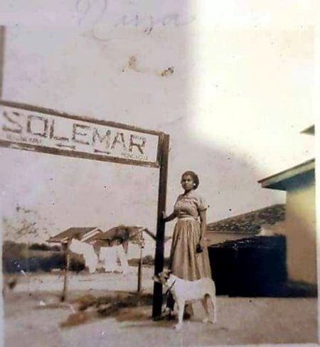 ACIMA: Em 1954, a estação de Solemar, a moça posa junto à placa (Foto Lucy Carvalho da Cunha).