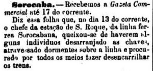 AO LADO: Somente tres dias depois da abertura da linha, já havia bandidos tentando descarrilhá-la em São Roque (A Provincia de S. Paulo,, 20/07/1875). |