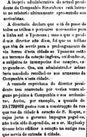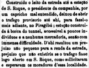 AO LADO: Apontando o erro de se ter aberto ao trafego provisorio primeiro a estação até Piragibu e não São Roque (A Provincia de S. Paulo, 14/12/1875). |