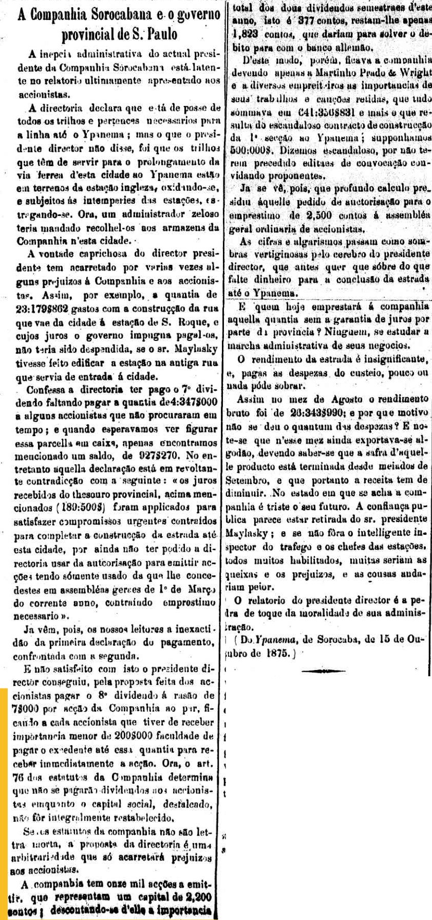 AO LADO: Jogando de novo a culpa na construção da estação de São Roque - CLIQUE SOBRE O TEXTO PARA VÊ-LO INTEIRO (A Provincia de S. Paulo, 13/11/1875). |