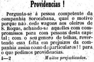 AO LADO: Faltam vagões para carga para São Paulo em São Roque (A Provincia de S. Paulo, 15/1/1880). |