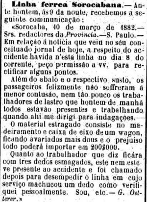 AO LADO: A resposta do diretor George Oeterer à notícia sobre o acidente em São Roque de dois dias antes (A Provincia de S. Paulo, 12/03/1882). |