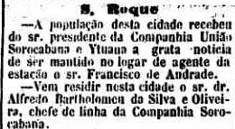 AO LADO: O chefe da estação na época, Francisco de Andrade, parecia ser muito querido pelos usuários em São Roque (O Estado de S. Paulo, 2/4/1902). |