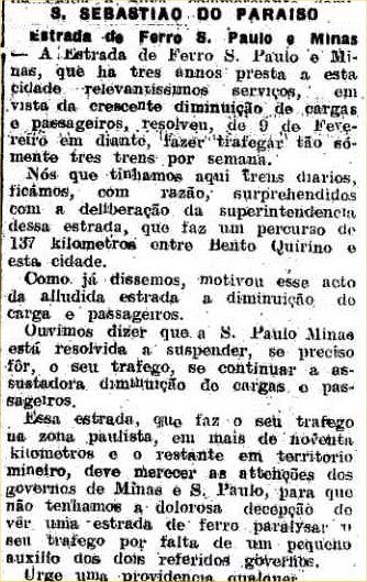 Entretanto, já em janeiro de 1914, portanto nove meses antes da abertura da estação da Mogiana, a São Paulo-Minas já notava uma grande diminuição em suas carga e transporte de passageiros. A linha da Mogiana já estaria funcionando de forma provisória antes de 1914, causando essa redução de movimento na ferrovia contrária? (ver caixa abaixo)