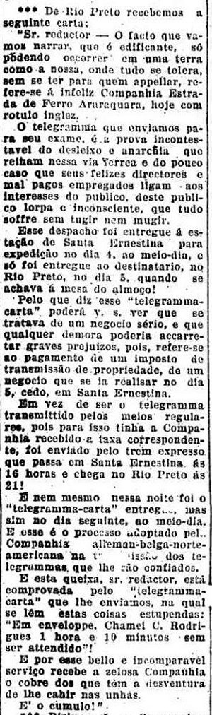 Ernestina causam transtornos para os seus usuários(O Estado de S. Paulo. 31/5/1901). |