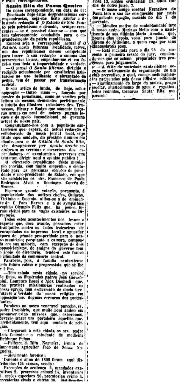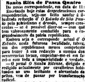AO LADO: A cidade de Santa Rita do Passa Quatro em 1891 (O Estado de S. Paulo, 16/02/1891). |