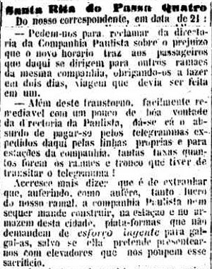 A Cia. Paulista, de acordo com os relatórios, comprou a E. F. Santa Rita em 1891. A linha ainda não funcionava.