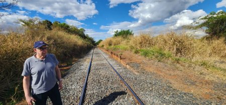ACIMA: Nada mais resta em 24/7/2023, apenas um escoramento no local onde existiu uma paradinha com telhado (Foto Gilson Marques - e eu, posando desolado ao lado do leito).