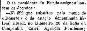 AO LADO: A estação de Estiva nem havia sido inaugurada e já mudava de nome. Em 1930 mudaria de novo (O Estado de S. Paulo, 4/2/1898). |