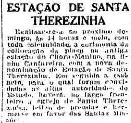 Em 1934, a estação ganhou o nome de Santa Terezinha,