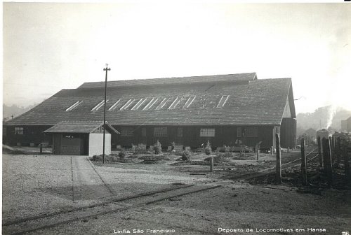 Depósito de locomotivas em Hansa, anos 1930. Acervo Nilson