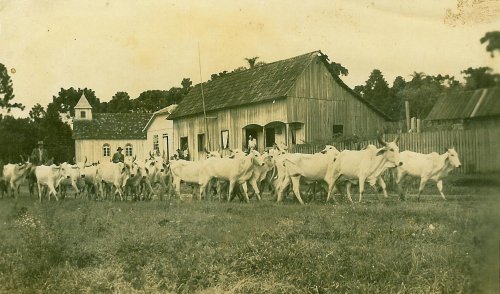 Abaixo, a vila de Canivete, com a igreja ao fundo. Anos 1950, provavelmente.