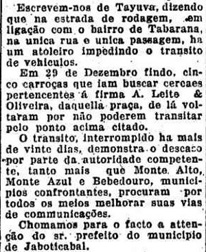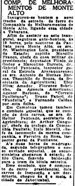 Portanto, foram duas inaugurações: uma para inaugurar o trecho maior (Monte Alto a Tabarana) e outra para inaugurar o trecho menor (Homem de Melo a Tabarana), que já havia sido inaugurado quando o trecho maior foi aberto em 1920.