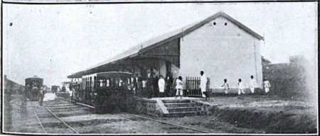 ACIMA: A estação de Tabarana na sua inauguração, no dia citado pela revista A Vida Moderna, 30/2/1921. Porém há dúvidas se é mesmo Tabarana, cujas fotos posteriores mostram um prédio muito pequeno. Pode ser a estação de Monte Alto.