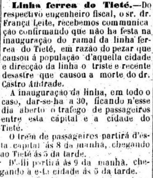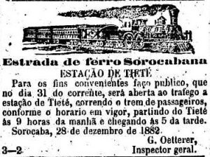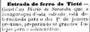 AO LADO: A inauguração da estação de Tietê. O anuncio dava a data de 31 de dezembro de 1882 para o evento, e foi publicado no jornal até 4 de janeiro de 1883 .(A Provincia de S. Paulo, 29/12/1883). |