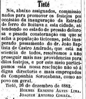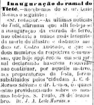 de Tietê foi inaugurada em 30 e 31 de dezembro de 1882, apesar de diversas idas e vindas por causa da morte inesperada de um figurão da cidade (ver caixas abaixo, de 1882).