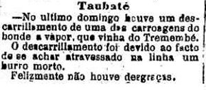 À DIREITA: Em 26 de julho é inaugurado o bonde a vapor entre Taubaté e Tremembé (A Provincia de S. Paulo, 30/07/1885).  |