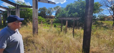 ACIMA: Em Três Fronteiras, o pátio cheio de mato e a comprida plataforma, em foto de Gilson Marques em 23/7/2023. Quem aparece na foto sou eu, autor deste site.