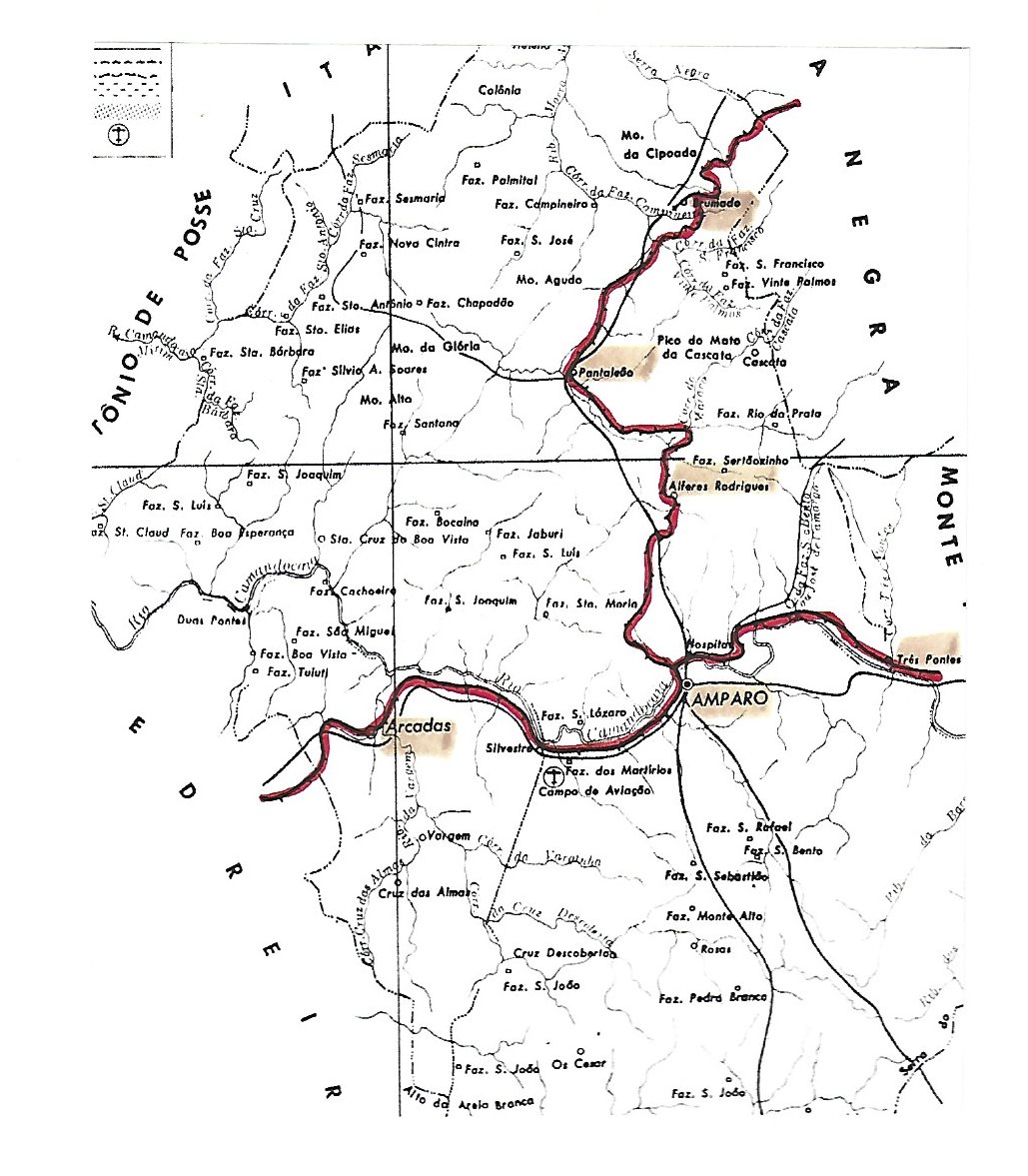 ACIMA: Mapa do município de Amparo em 1960 (CLIQUE SOBRE O MAPA PARA VÊ-LO MAIOR). Nele aparecem as estações de Amparo, Arcadas, Três Pontes e as de Alferes Rodrigues, Pantaleão e Brumado, estas três últimas no ramal de bitola estreita para Serra Negra (IBGE: Enciclopédias dos Municípios Brasileiros, 1960).