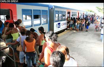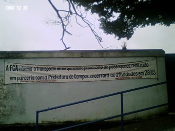 manobra na estação de Campos em 01/2007 (Foto Regina Linhares). feita no mesmo local do antigo posto telegráfico que ali existia em tempos idos, e que ficava a aproximadamente 2 km da estação central de Campos? Segundo Regina Linhares, de Campos, ela fica praticamente no mesmo lugar. De qualquer forma, é difícil saber até quando este trem operará. Resta apenas o consolo de ser este um dos pouquíssimos trens de passageiros em operação num País que, na contramão do mundo, desistiu de seus trens de passageiros, tendo pouquíssimas linhas de longo percurso - especificamente, somente duas, da Vale do Rio Doce. Já era hora de se repensar no assunto e voltarmos a ter trens de passageiros de forma a termos uma alternativa boa e saudável. Enfim, viajar de trem é a melhor forma de se viajar. E quando a situação apertou em Campos, o trem "salvou a pátria", e há que se louvar o poder público, que agiu realmente rápido, sem ficar em promessas que perduram por uma eternidade sem apresentar ação alguma. O trem andou até 16 de fevereiro, houve uma pausa durante o carnaval e depois, no dia 22 de fevereiro, voltou a correr. Há duas paradas, além da inicial na estação de Campos: uma na Av. Carmen Carneiro, no bairro de Jardim Carioca, e outra no Parque Novo Mundo. O jornal de março de 2007 já cita horários diferentes: 6 às 8:30 e 16:30 às 20 horas. Em 13 de julho de 2007, o trem parou de vez, o contrato acabou e a FCA nem pensou em renovação, no meio de uma grande crise financeira que a levou a fechar o tráfego de cargas por diversas de suas linhas, no Nordeste e no Rio - região de Campos, por coincidência. Tentou-se a renegociação, mas nada aconteceu por enquanto. Parece que o campista voltou a ficar sem seu trem. Segundo informações destes últimos dias, inicialmente, o trem só trafegava entre a Estação da antiga Leopoldina até a avenida Carmem Carneiro. Depois, foi estendido até o Posto Novo Mundo, beneficiando moradores de outros bairros, que precisam atravessar para a margem direita, para trabalhar e estudar. Aqui ele parava quando suas operações cessaram. Porém, ele voltou a circular em 29 de outubro de 2007: "Com boa parte dos bancos ocupados e alguns passageiros em pé, entre eles o secretário de Transportes, Julio Lopes, e o prefeito de Campos dos Goytacazes, Alexandre Mocaiber, partiu da estação central de Campos rumo ao bairro de Guarus, às 16h30 da tarde desta segunda-feira, o trem que está circulando para atender parte da população do município (...) A viagem marcou a reativação da composição de três vagões, cedidos pela Secretaria de Transportes, que funcionou de janeiro a julho de forma emergencial, e cuja circulação havia sido suspensa pela ANTT (Agência Nacional de Transportes Terrestres), até que nova autorização fosse concedida. Com a autorização da agência para a volta do trem, a prefeitura espera melhorar o deslocamento dos moradores dos parques Novo Mundo, Jardim Carioca, São Matheus, Guarus e de outras comunidades que precisam atravessar o rio para chegar ao Centro de Campos. O trem liga os dois lados da cidade e se tornou uma alternativa importante para os 150 mil moradores da periferia de Guarus, enquanto a obra de reconstrução da ponte não é concluída" (www.governo.rj.gov.br/noticias). Como dito acima, parou em 28 de março de 2008. Acima