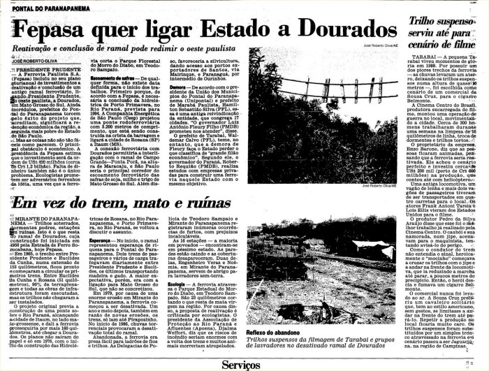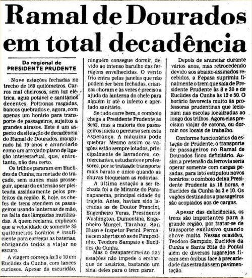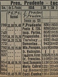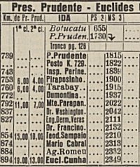 Cunha, no Pontal do Paranapanema, pelo ramal de Dourados. Origem da linha: 1957-P. Prudente - Engenheiro Murgel; 1960 - até Teodoro Sampaio; 1965 - até Euclides da Cunha. O ramal foi desativado para trens de passageiros em 30 de novembro de 1978, para cargas em 1980, e suprimido de vez em 1988. ![]() Já em março de 1978, somente existia um trem misto e que saía no final da tarde de Presidente Prudente (Guia Levi, março de 1978). |
