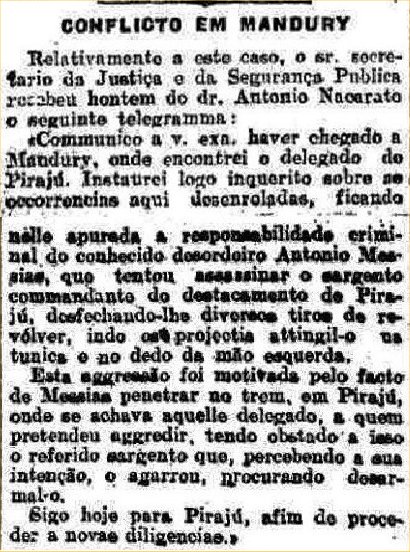O trem do ramal de Piraju saía da estação de Manduri e seguia até a estação de Piraju, num percurso de 26 quilômetros. A partir da estação, relativamente longe da cidade, em sua parte alta, os passageiros podiam tomar uma linha de bondes, que funcionou de 1915 aos anos 1930, para chegar ao centro da cidade, que ficava mais abaixo e após se cruzar a ponte sobre o rio Paranapanema. |