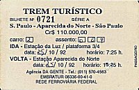 chamada popularmente de Aparecida do Norte). Origem das linhas: O trem passava pelo trecho Luz-Brás (1867), daí até Engenheiro Gualberto, no Carrão (1908), entrava pela variante de Poá (de 1934) e do Parateí (de 1952), entrando no ramal de São Paulo a partir de São José dos Campos, daí até Aparecida por uma linha construída originalmente em 1908 (com bitola larga), mas modificada em diversos pontos por variantes construídas entre os anos de 1950 e 1970. Vale ressaltar que o trecho original entre São Paulo e Aparecida foi construído em bitola métrica pela E. F. do Norte entre 1875 e 1877, e com o tempo todo modificado pela Central do Brasil, inclusive na bitola. |