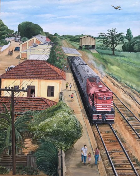 ACIMA: Ultimo trem da FEPASA em 2001 (Tela de autoria de Aicro Junior, em acrílico, mostrando a estação de Uchoa durante a última viagem de trem de passageiros da região no ano de 2001. Aicro comenta: "Adorava viajar de trem e me lembro com carinho dessa linda imagem que o fotógrafo Sérgio Menezes fez sobre uma passarela na estação de Uchoa para uma matéria no Jornal Diário da Região, imagem que que utilizei como inspiração pra essa releitura. A composição partiu de Rio Preto para Itirapina, possuía dois vagões e foi conduzida pela 7057, uma locomotiva do tipo G12, conhecida carinhosamente entre os funcionários da antiga Fepasa como 'Cabeça de Saúva'. Acrílico sobre tela, medindo 1m x 80 cm").