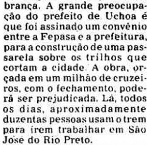 AO LADO: Em parte de uma reportagem sobre o fim de várias estações das antigas Cia. Paulista e E. F. Araraquarense em 1976, o prefeito de Uchoa estava preocupado que a estação da cidade também fosse fechada. (O Estado de S. Paulo, 28/11/1976) |