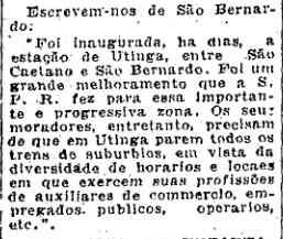 AO LADO: A SPR anuncia a construção da estação onde já havia um posto telegráfico em Utinga (O Estado de S. Paulo, 19/3/1932).