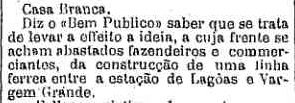 AO LADO: Antes da Mogiana, já se apresentava um projeto de fazendeiros locais para a ferrovia (O Estado de S. Paulo, 17/8/1894). |