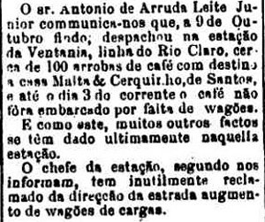 AO LADO: Falta de vagões na estação (aliás um problema recorrente por toda a história das ferrovias brasileiras) (A Provincia de S. Paulo, 9/11/1889). |
