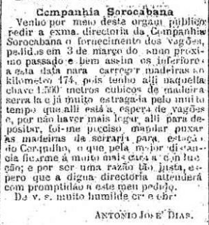 AO LADO: A quilometragem da Sorocabana no século XIX ainda não era as que do século XX, mas esta chave talvez ficasse muito próxima de Cerquilho nesta época, poderia estar muito próxima à estação de Vereda, somente aberta em 1927 (O Estado de S. Paulo, 08/3/1893). |