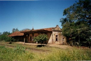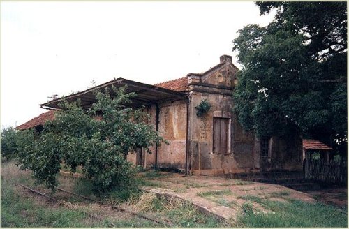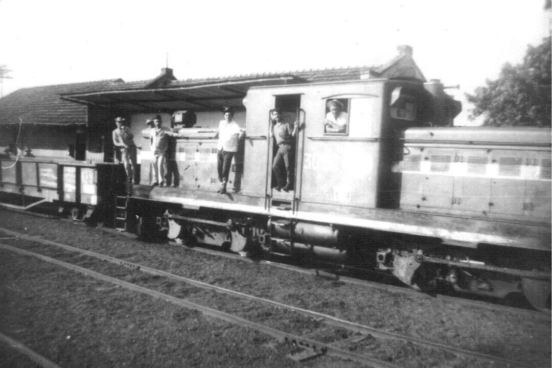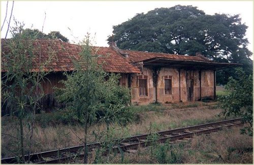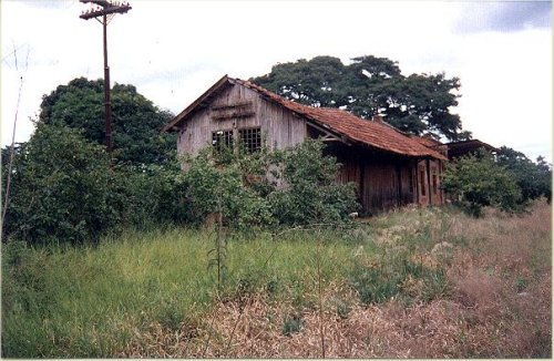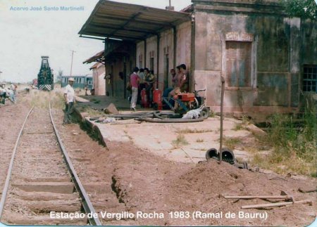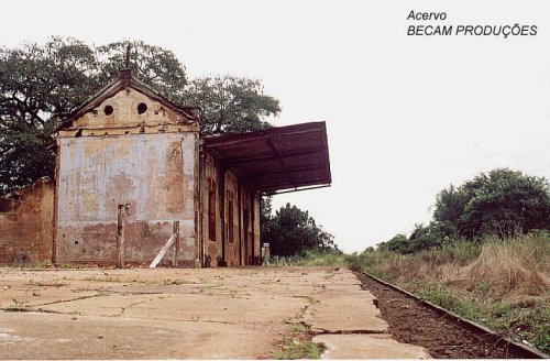 ACIMA: Imagem do abandono na estação, já desativada, em foto de 1983 . Notar que ainda havia carros de passageiros, provavelmente também abandonados, no triângulo ao fundo, na foto(acervo José Santo Martinelli).