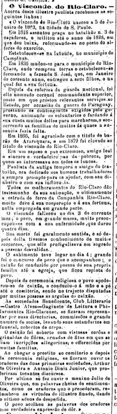 AO LADO: Em 4 de setembro faleceu o Visconde do Rio Claron e o jprnal contava sua vida - CLIQUE SOBRE O TEXTO PARA LER A REPORTAGEM INTEIRA (A Provincia de S. Paulo, 10/9/1884). |