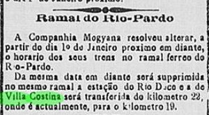 À ESQUERDA: A estação do Rio Doce será suprimida e a de Vila Costina será transferida do km 22 para o km 19 (Correio Paulistano, 29/12/1888). |